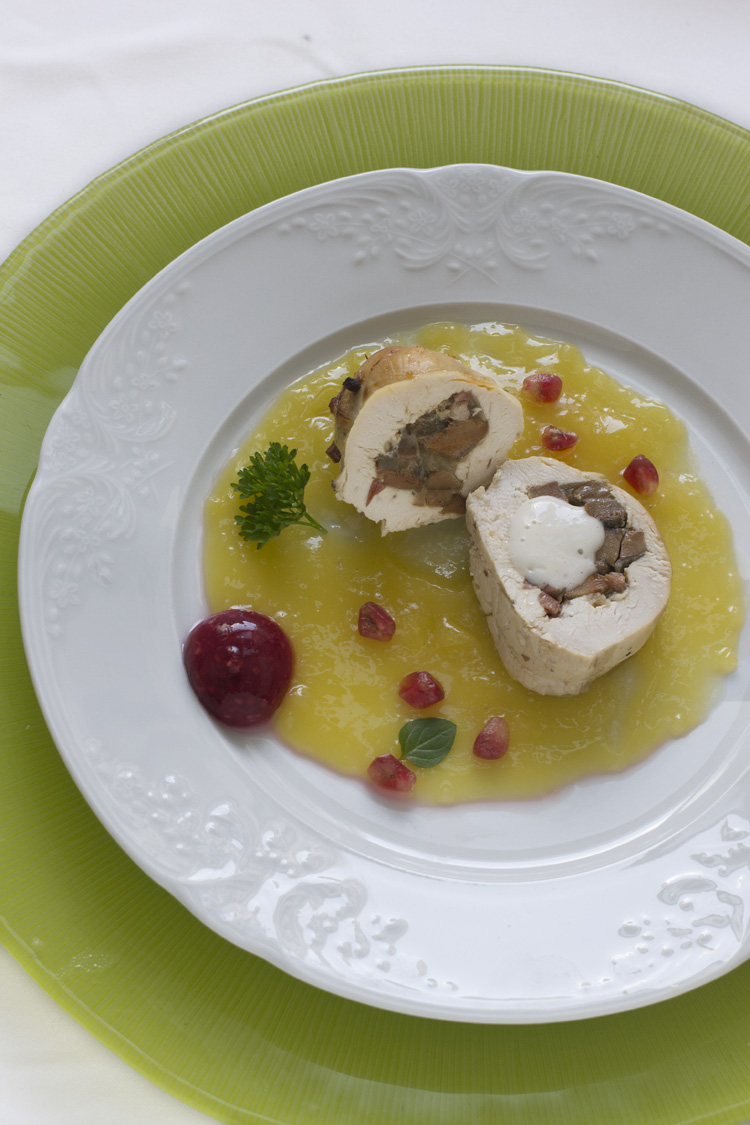 Pechugas rellenas de níscalos con ravioli de frambuesa, salsa de maracuyá y coco líquido
